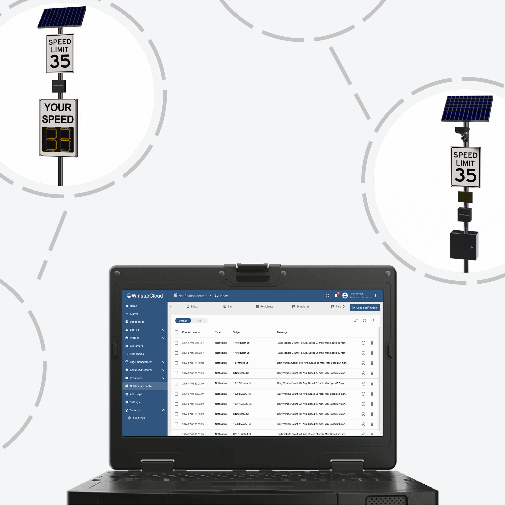 Winstar Cloud integrates radar speed signs, traffic cameras, and beacons in one live dashboard for law enforcement, communities, and businesses.